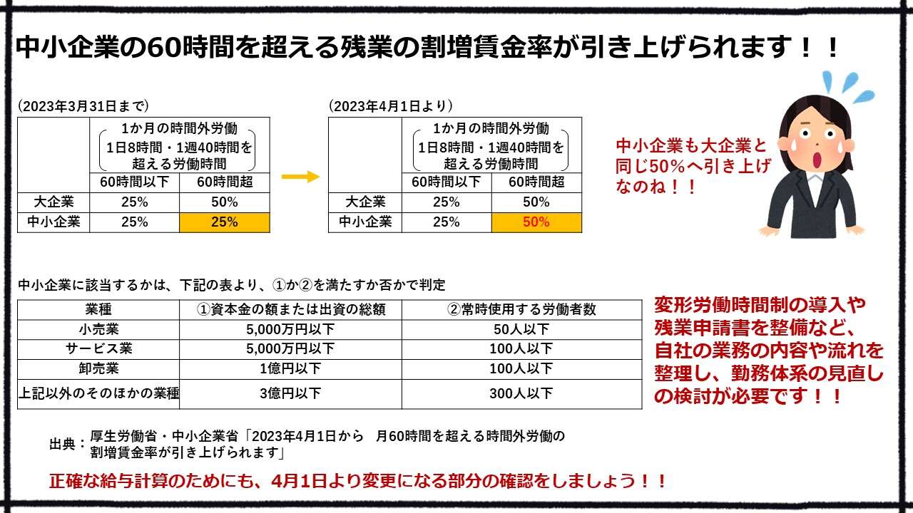 令和5年4月1日より、中小企業の月60時間超の時間外労働に対する割増賃金率が25%から50%になります。