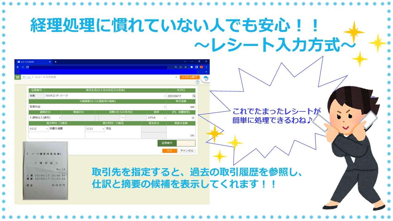今回は、前回ご紹介した豊富な仕訳入力方式の一つ、レシート入力方式のご案内です♪