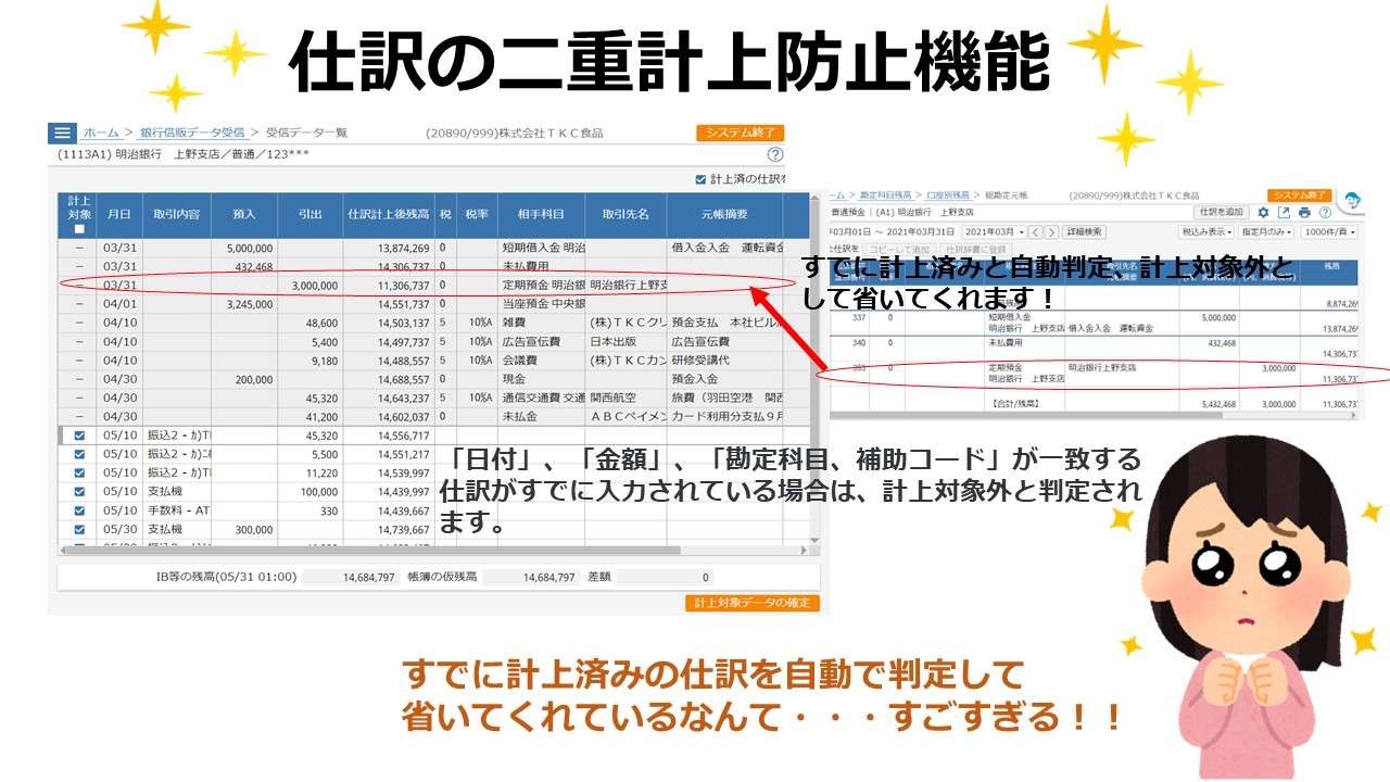 銀行口座への預入、銀行口座からの引出、銀行口座間の振替取引など、受信した取引データとシステムに計上済みの仕訳を突合し、仕訳の重複を自動チェックし、入力してしまわないように省いてくれます!