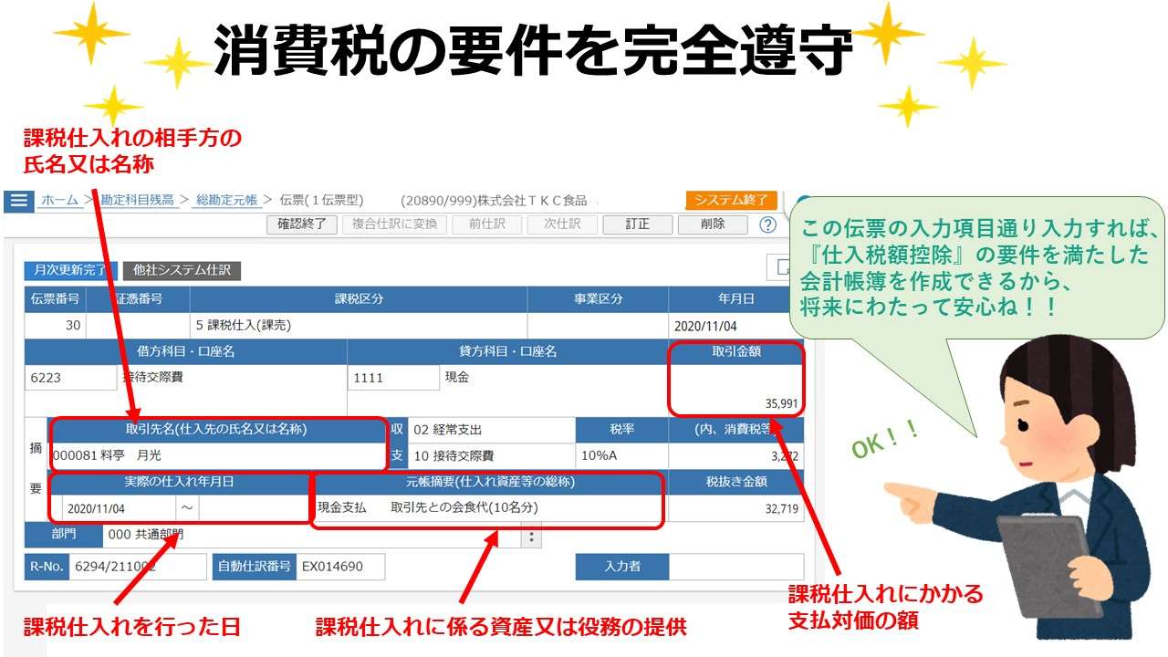 ですので、この伝票の入力項目通りしっかり入力していれば、『仕入税額控除』の要件を満たした会計帳簿を作成できるため、将来にわたって安心してお使いいただけます^^